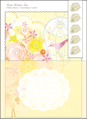 封筒は中の便箋が透けて見えるカラートレペ製!便箋には美しいイラストが施され、とってもロマンティック♪【レターセット】L-297 糸乃レターセット イエロー